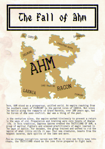 CHAPTER 1: THE ROAD TO WAR is the 8-page SHAREWARE version of TACTICIANS OF AHM. It contains basic information about the world of AHM, basic rules of play and starting stats and abilities for 4 classes!